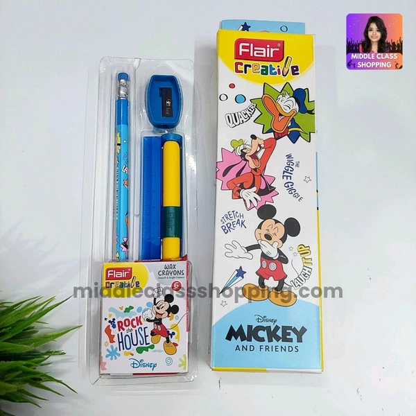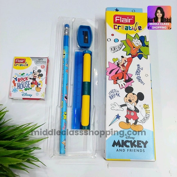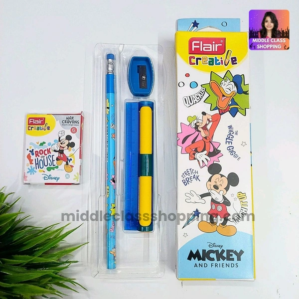 Flair Creative Trending Disney Mickey Gift Pack With Pencil, Sharpner, Crayons, Unique Scale With Sliding Eraser MC872