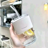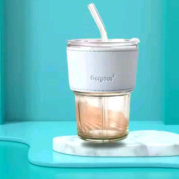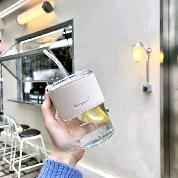 Trending Cute Luxury Transparent Glass Juice Or Coffee Cup With Straw And Leather Finish Holding Grip Support MC680